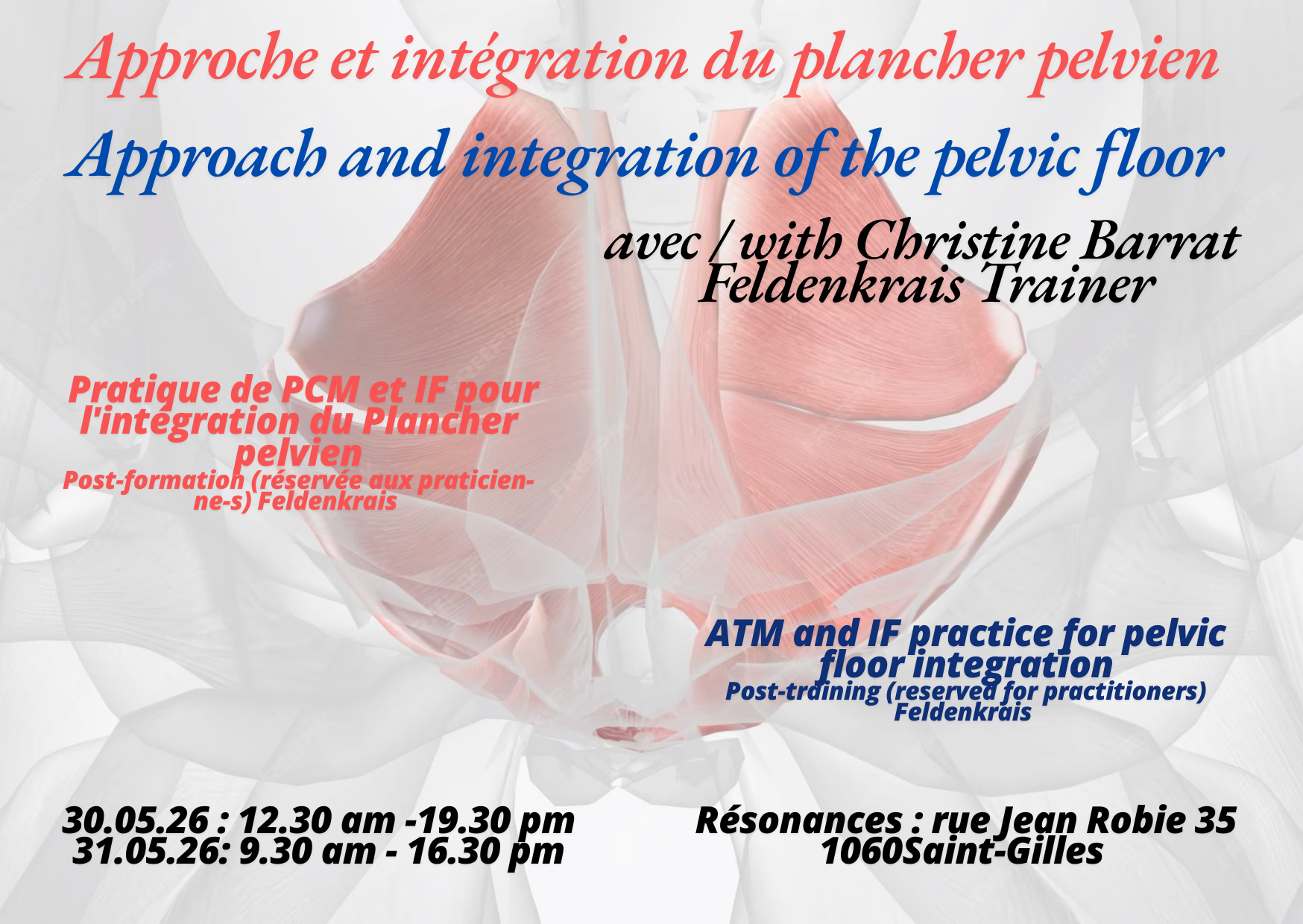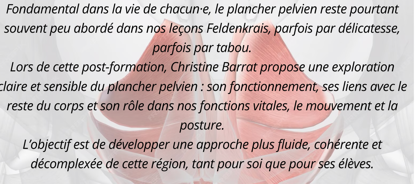 Christine Barrat, formatrice Feldenkrais, animera l’atelier par des pratiques de PCM et IF pour l’intégration du plancher pelvien